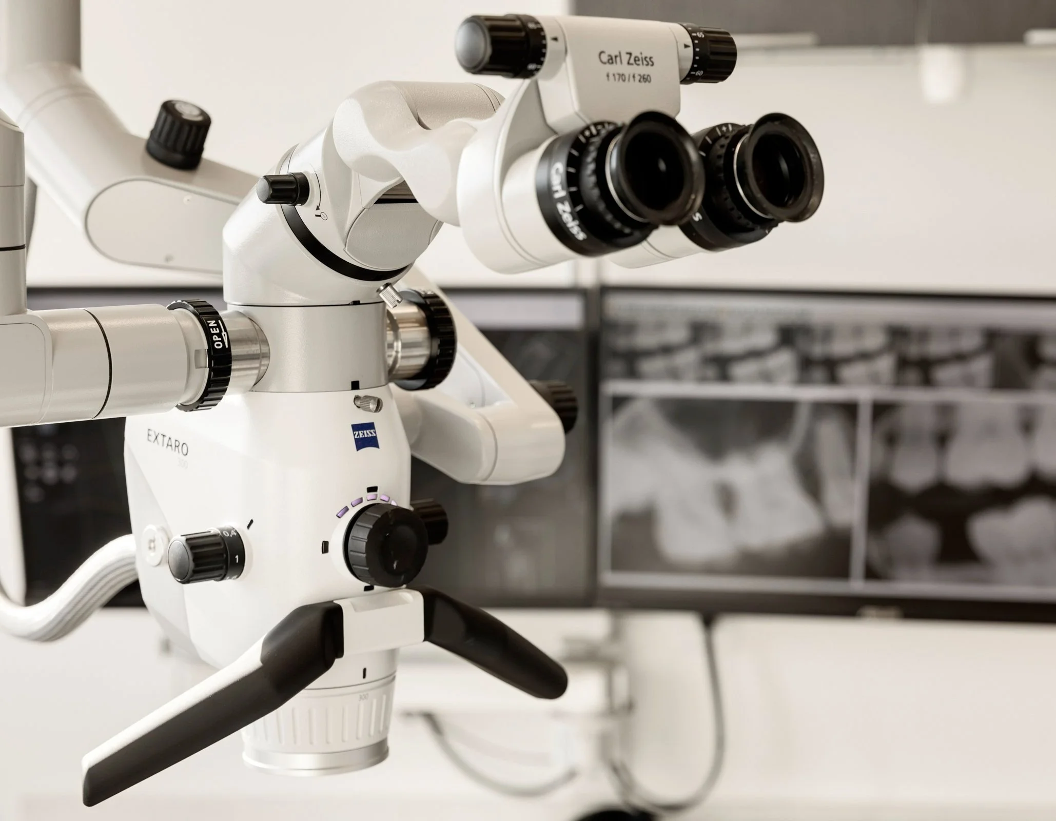 Clinica noastră dispune de cea mai performantă aparatură pentru realizarea unor tratamente endodontice de succes. Tratamentul cel mai corect al canalelor radiculare poate fi realizat doar cu ajutorul microscopului, folosind o magnificație sporită și o iluminare corespunzătoare. Folosirea microscopului în tratamentele de canal a permis rezolvarea multor cazuri foarte dificile, cu un prognostic rezervat.